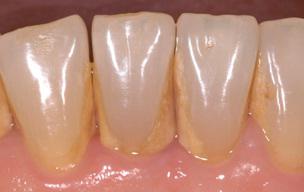Immagini di accumulo di placca batterica e tartaro su superfici dentali.